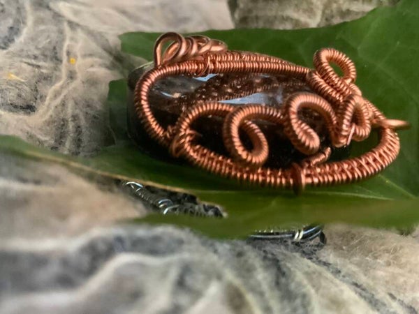 Der Resinstein wurde mit einerbesonderen Technik bearbeitet, so dass die Oberfläche ein Farbenspiel an Seifenblasen wiedergibt. Gefasst wurde der Stein in reinem Kupfer..
