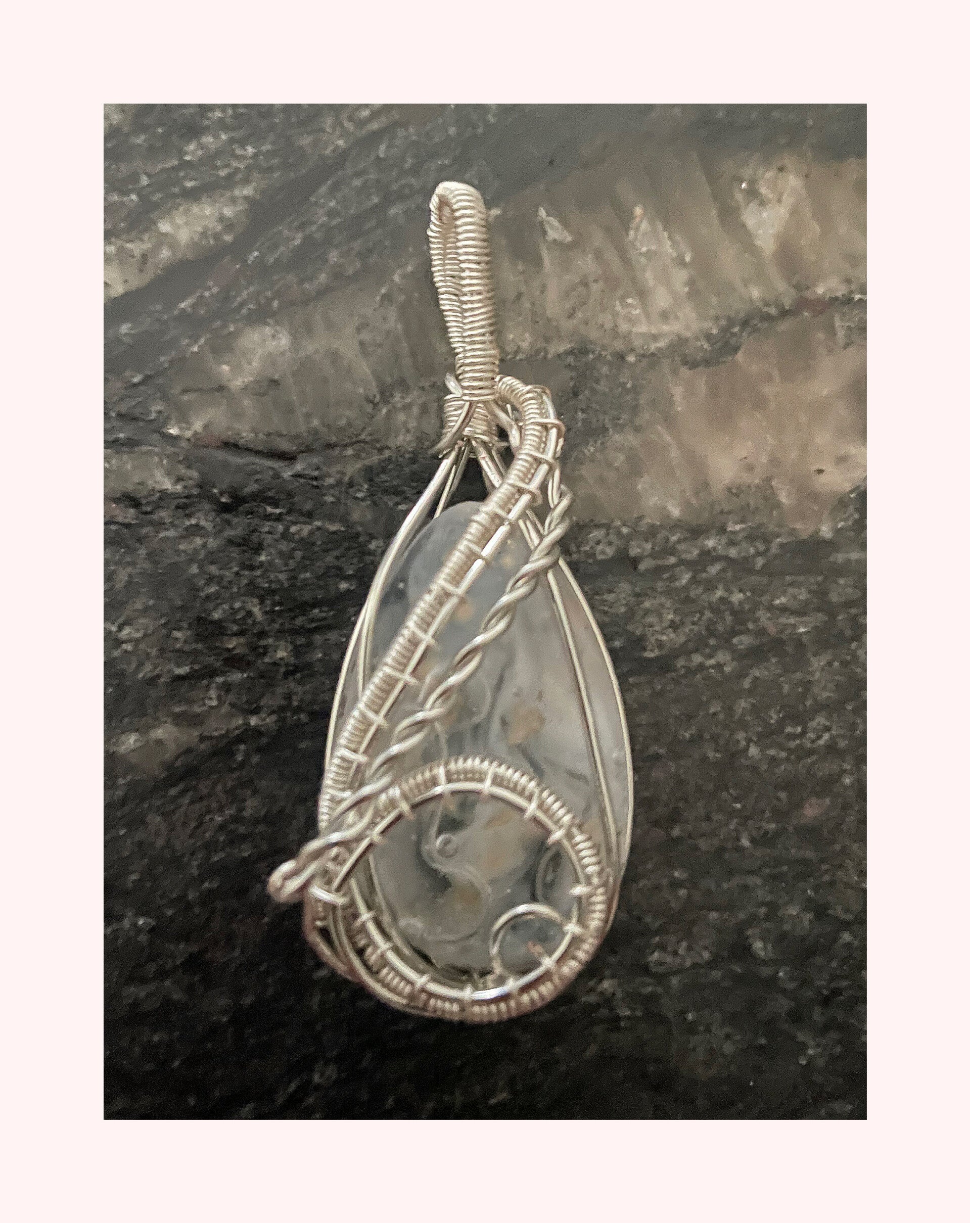 Der ovale Resinstein in zarten Farben weiß/grau wird von silbernem Schmuckdraht gehalten.