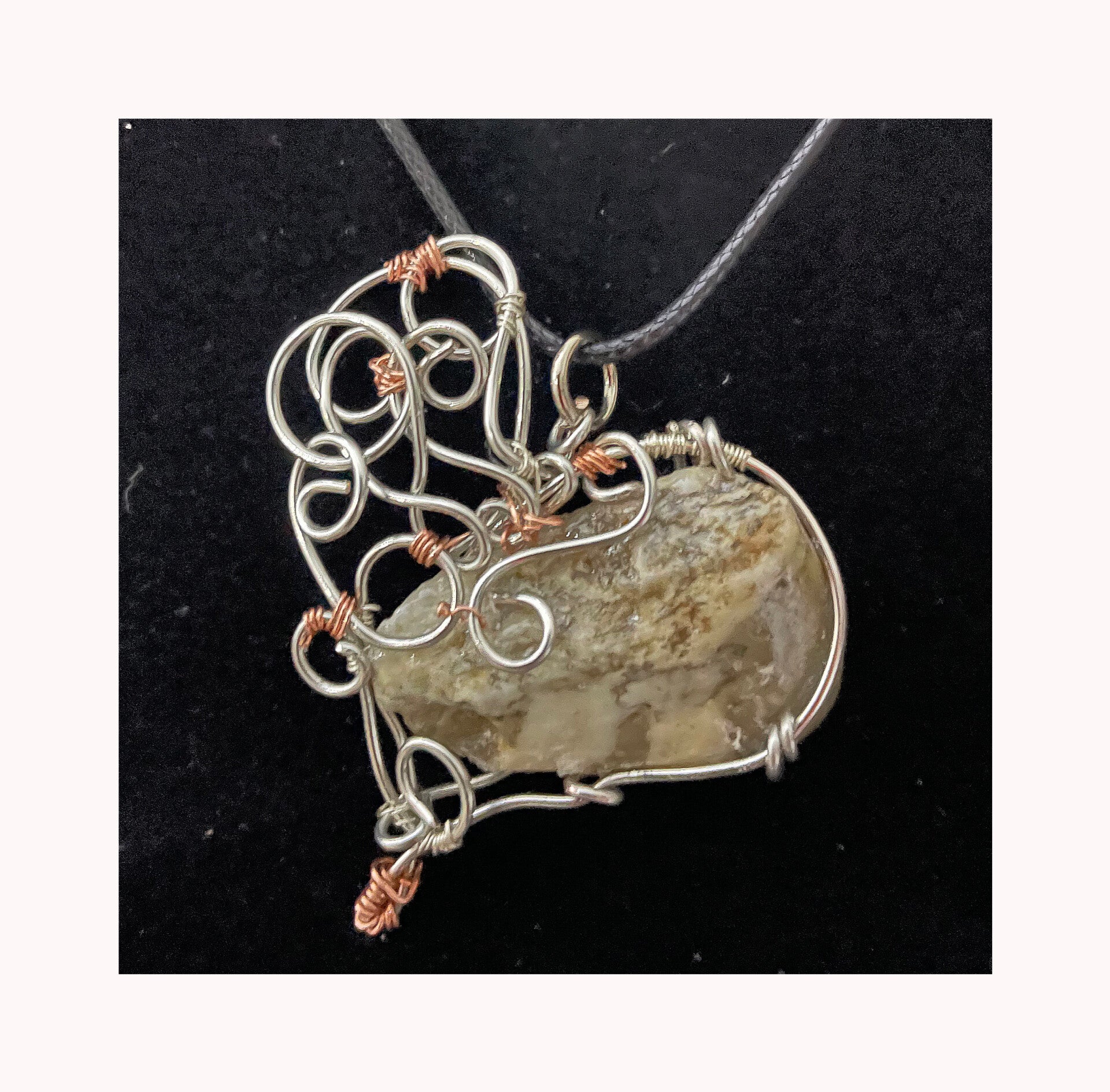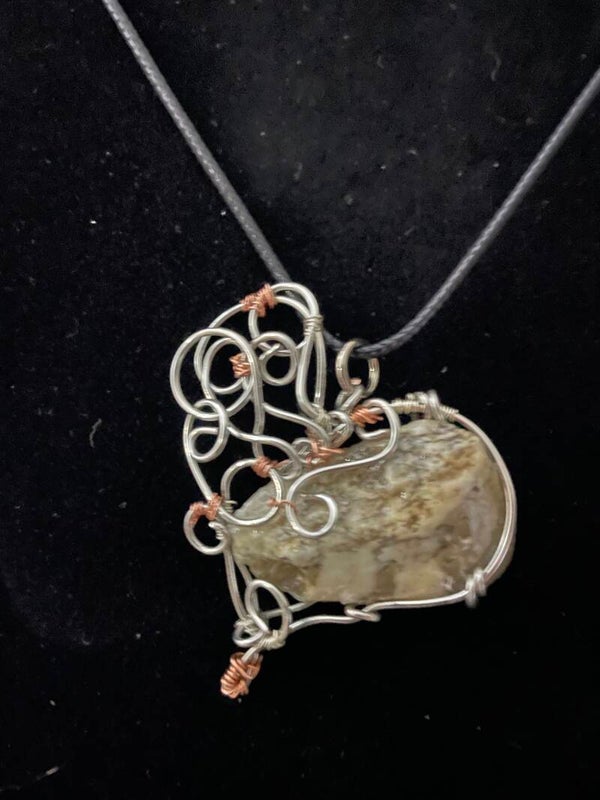 Der wunderschöne Stein wird von silbernem Schmuckdraht gehalten. Der Anhänger wird mit einem schwarzen Lederband, circa 42-45 cm lang, ausgeliefert.