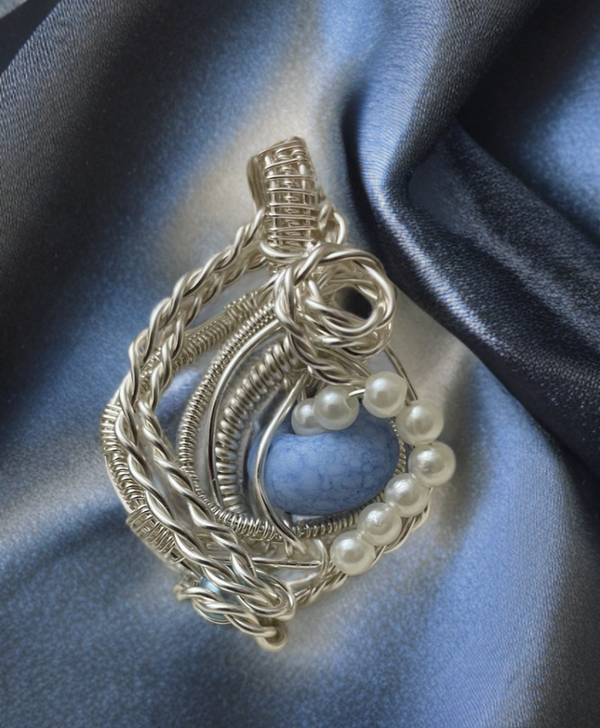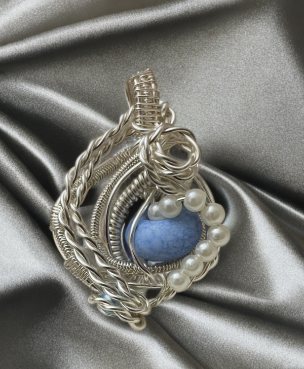 Anhänger mit einer blauen Perle und gedrehtem und gewebtem silbernem Schmuckdraht . Die kleinen Perlen verzieren den Anhänger. Das Schmuckstück wird mit einem Lederband, circa 45 cm lang, ausgeliefert.