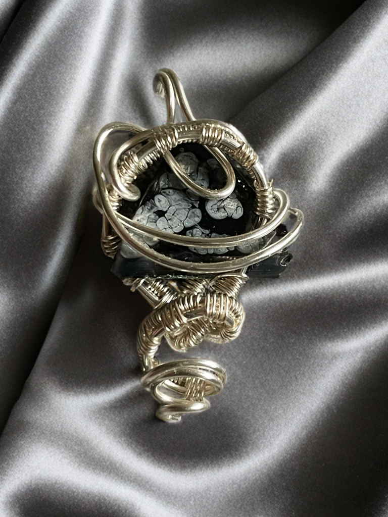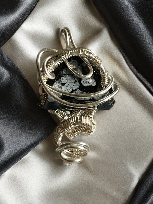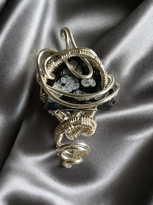 Ein kleiner schwarz/weißer Resinstein ist filigran mit anlaufgeschütztem Schmuckdraht gehalten