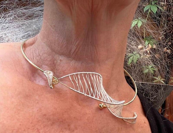 Massives Collier mit einem filigran gewebtem Blattmotiv.