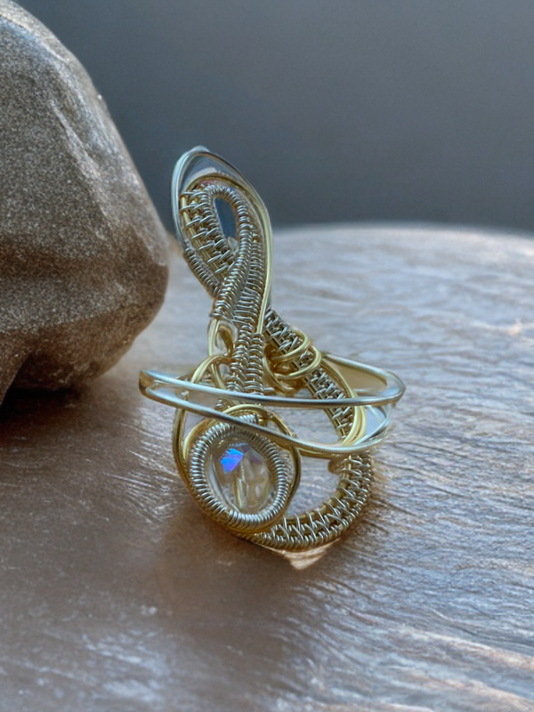 Der Kettenanhänger ist aus silbernem und goldenem Schmuckdraht filigran gewebt und extravagant umschlungen. Ein schwarzes Lederband, circa 45 cm lang, ist dabei.
