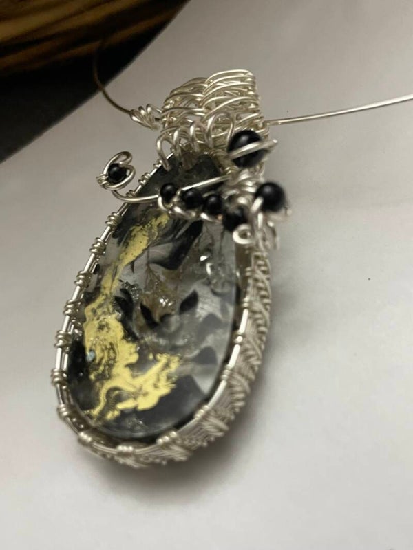 Der Kettenanhänger ist filigran gearbeitet und ein schönes Muster fasstden schwarz / goldenen Stein. ein schwarzes Lederband circa 45 cm lang ist dabei