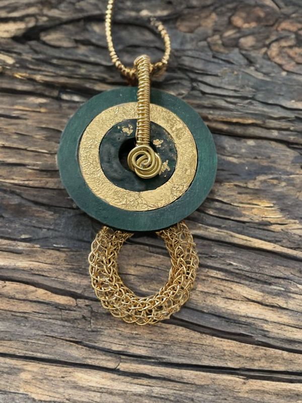 Die grün / goldenen Elemente bilden hier eine Spirale und werden doch einen aus Draht gehäkelten Kranz ergänzt