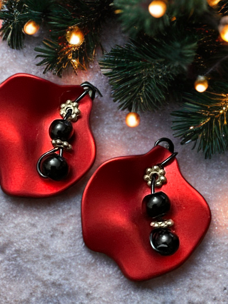 Die roten Rosenblätter sind mit schwarzen Perlen verziert. Sie können die Ohrringe als Ohrstecker oder als Hänger bestellen, gerne mit einem Rosenblatt als Kettenanhänger.