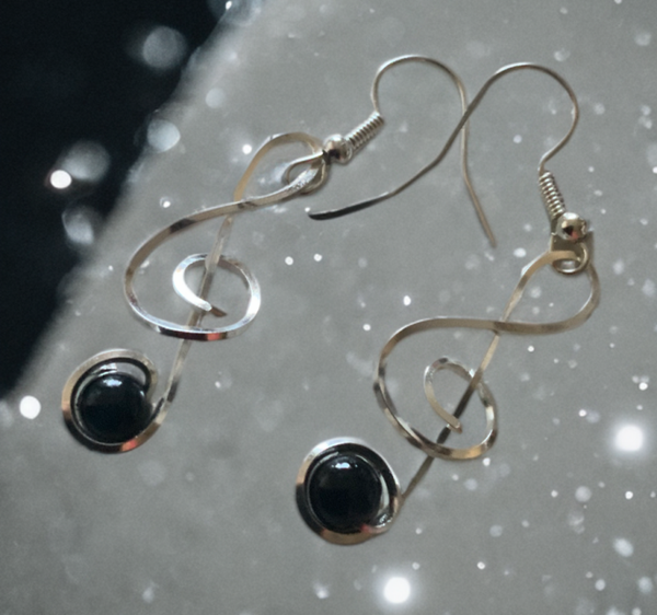 Ohrringe als Hänger mit schwarzen Perlen, geschwungen aus flachem Silbetdraht