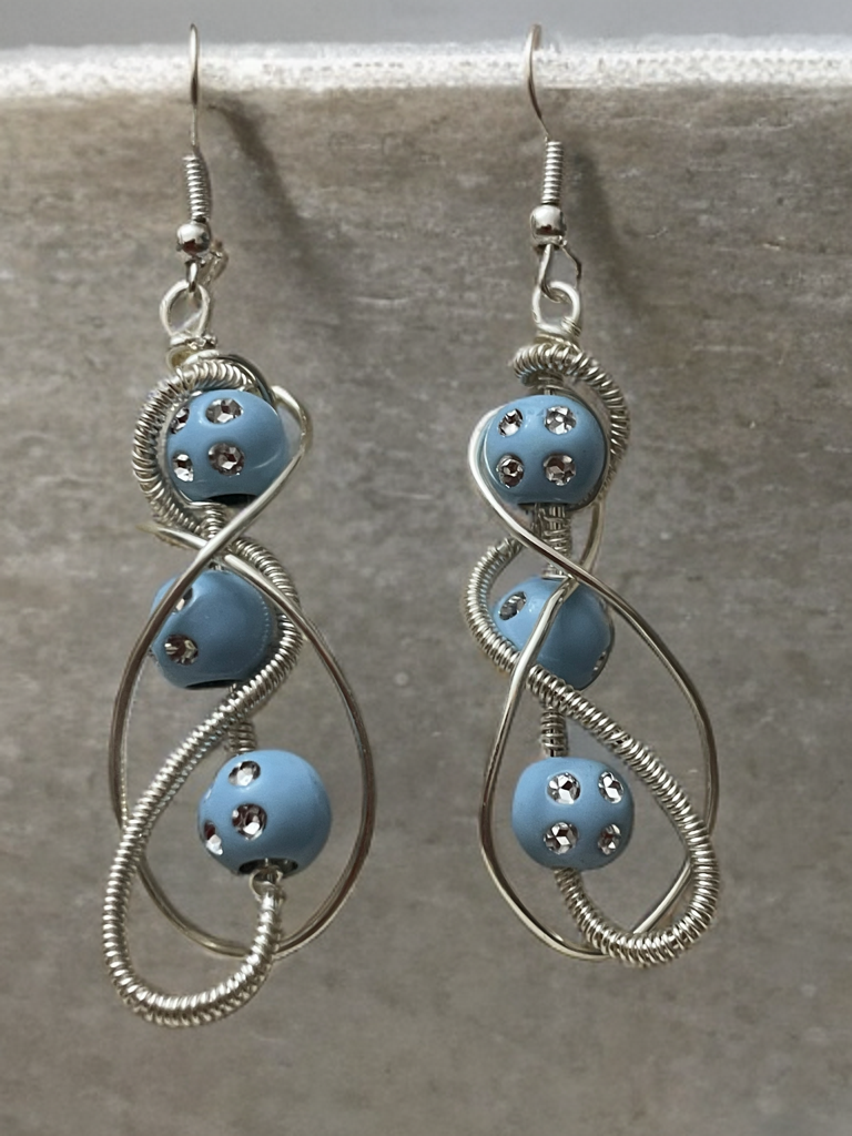 Drei hellblaue Perlen mit kleinen Strasssteinen sind mit einem anlaufgeschütztem silbernen Schmuckdraht schwungvoll in Form gebracht